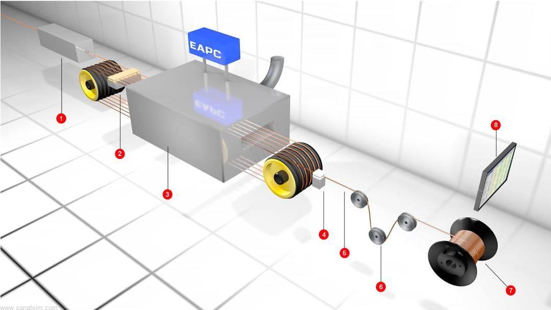 ۶ در ادامه سیم لاک خورده داغ بر روی قرقره های تایین شده در خط تولید تحت کشش قرار گرفته تا نرم شود